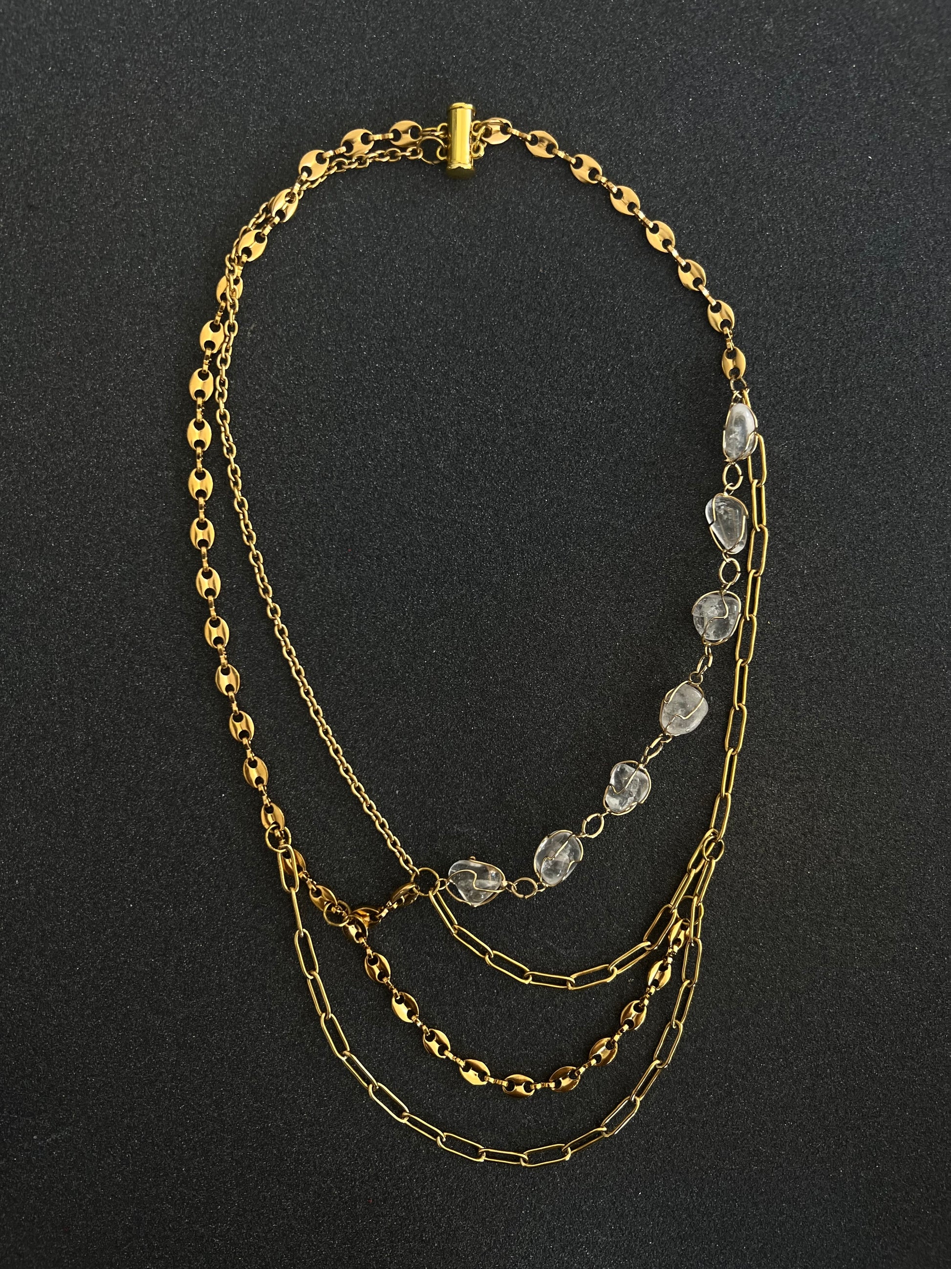 Collar dorado con cuarzo blanco y cadenas de diferentes estilos y cierre magnético
