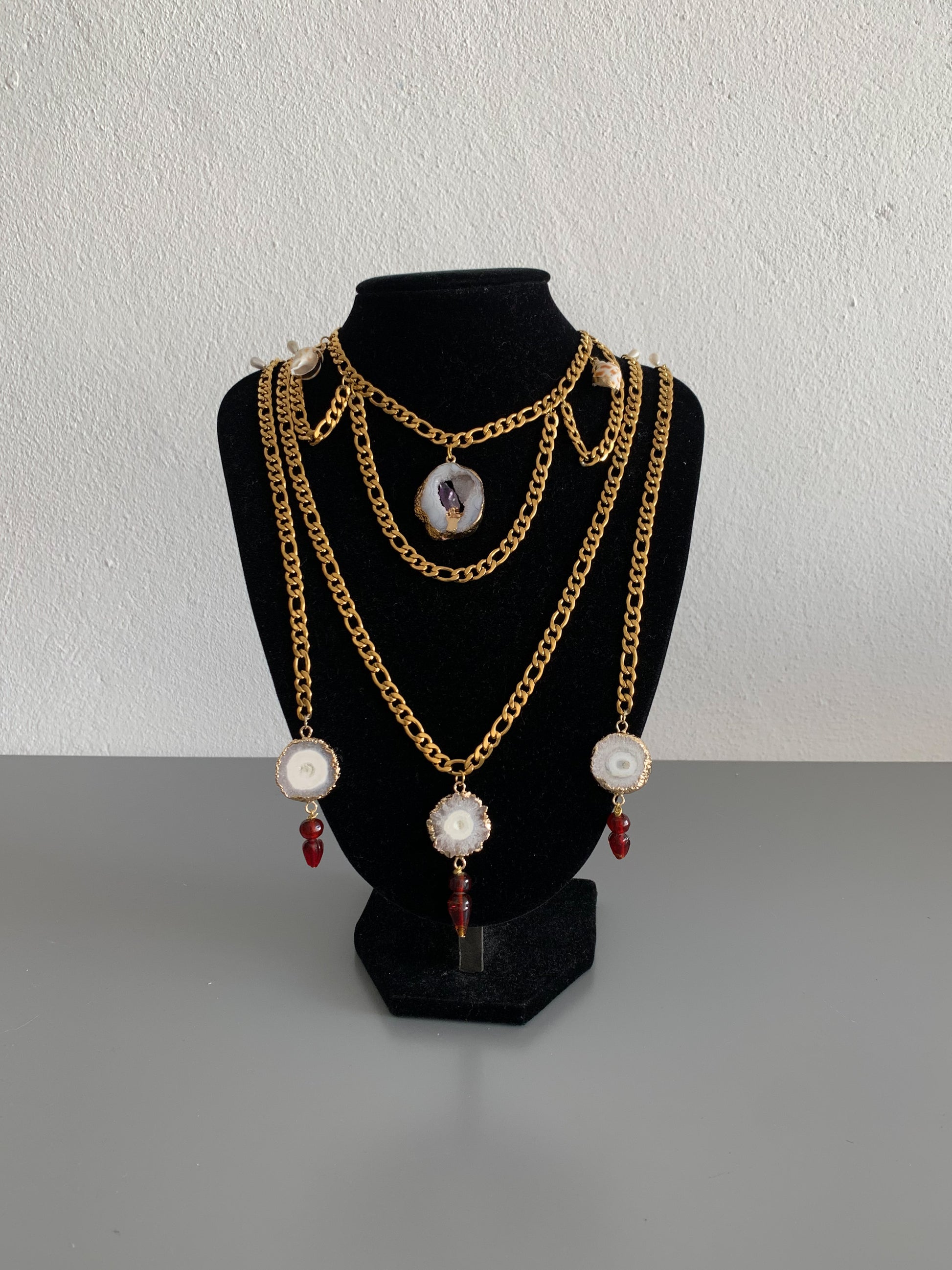 Collar dorado con cuarzo blanco natural, piedas de cristal italiano y conchas bañadas en oro.